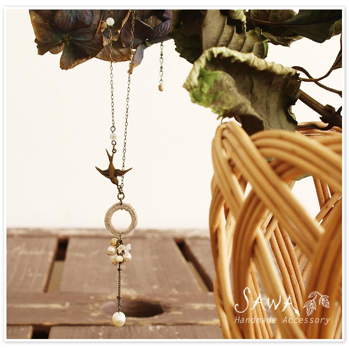 *【10%OFFクーポン対象商品】【SAWA サワ】 天然石 ・ 淡水パール と ドーナツ編みモチーフと トリ パーツ の ネックレス (n-14) ハンドメイド 手作り 作家 鳥 鳩 ハト アクセサリー レディース ナチュラル 平和
