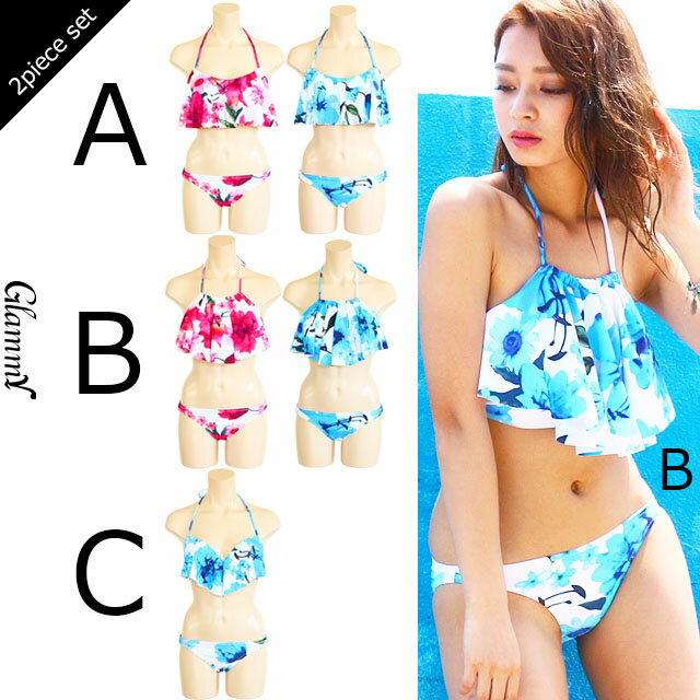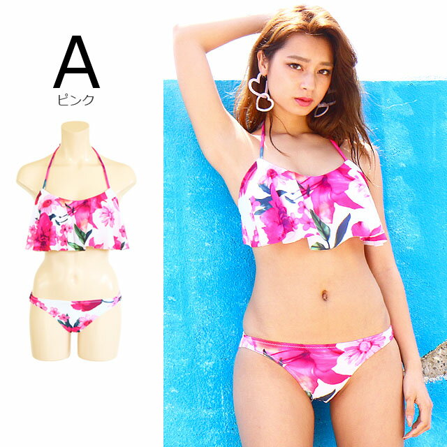送料無料 水着 ビキニ 花柄 ロングフリル ワイヤーブラ 2点セット水着 レディース ホルターネック セパレート ユリ柄 COM2 ネコポス1 /m-w-0332